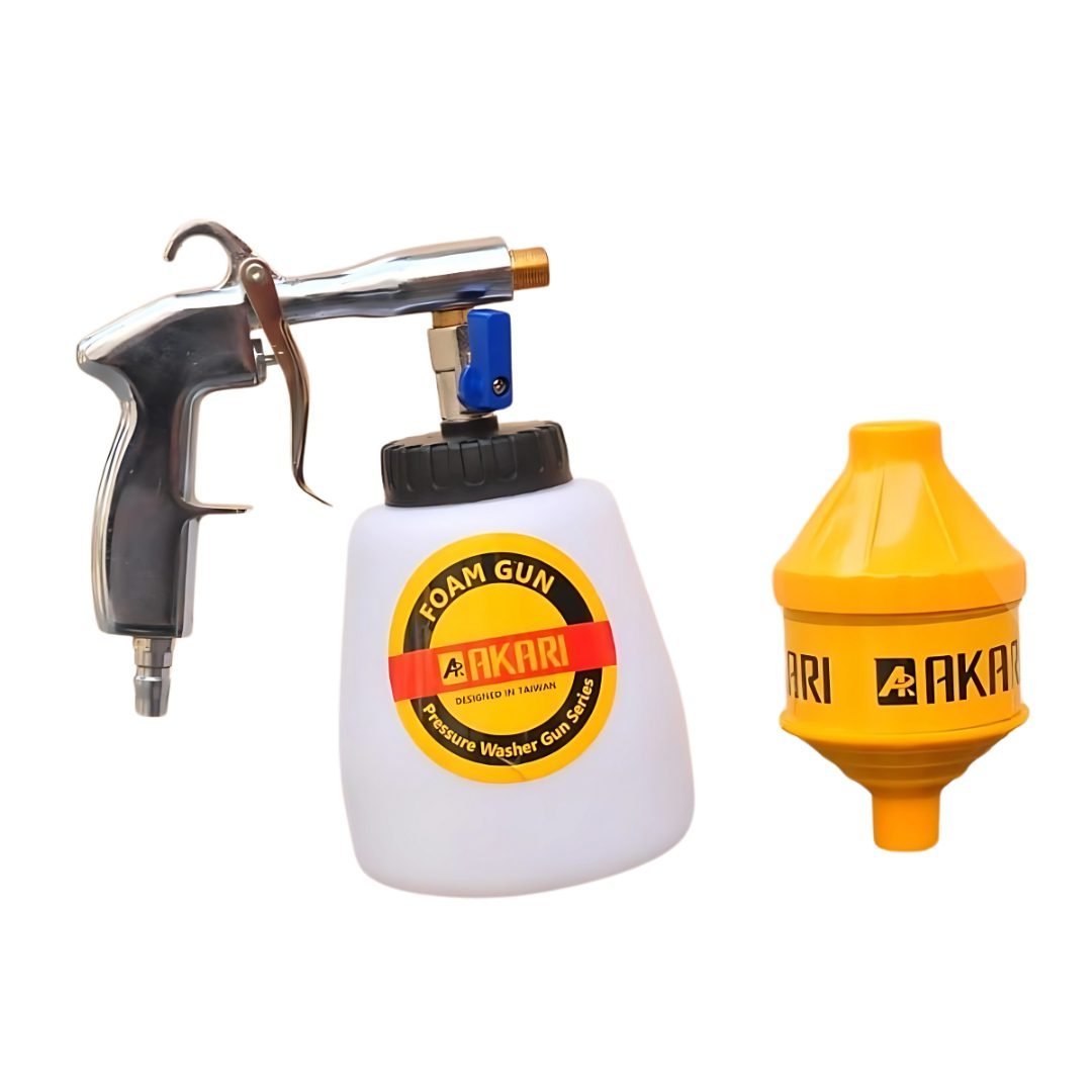 He foam wash gun, which is connected to the air compressor, sprays snow foam with pressure into automobiles, bikes, and other vehicles when it is filled with shampoo and water.